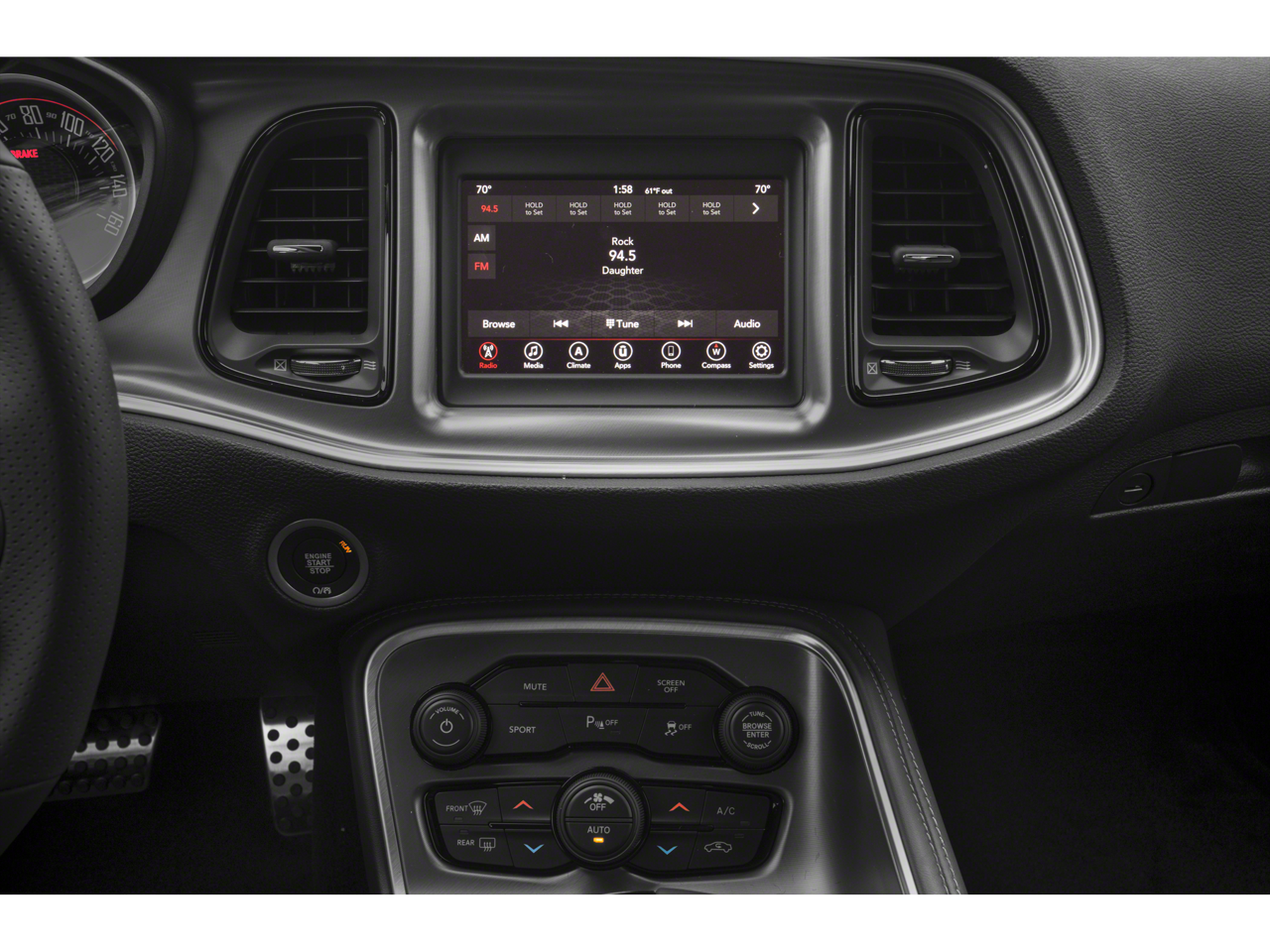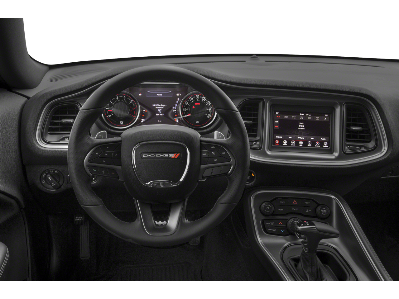 Quick Order Package 28H R/T, 4-Wheel Disc Brakes, 6 Speakers, ABS brakes, Air Conditioning, Alloy wheels, AM/FM radio, Anti-whiplash front head restraints, Apple CarPlay, Apple CarPlay/Android Auto, Auto-dimming Rear-View mirror, Automatic temperature control, Brake assist, Bumpers: body-color, Compass, Delay-off headlights, Driver door bin, Driver vanity mirror, Dual front impact airbags, Dual front side impact airbags, Electronic Stability Control, Four wheel independent suspension, Front anti-roll bar, Front Bucket Seats, Front Center Armrest, Front dual zone A/C, Front fog lights, Front reading lights, Fully automatic headlights, Garage door transmitter, Google Android Auto, GPS Antenna Input, Heated door mirrors, Houndstooth Cloth Performance Seats, Illuminated entry, Integrated Voice Command w/Bluetooth®, Leather Shift Knob, Low tire pressure warning, Media Hub (2 USB, AUX), Outside temperature display, Overhead airbag, Overhead console, Panic alarm, ParkView Rear Back-Up Camera, Passenger door bin, Passenger vanity mirror, Power door mirrors, Power driver seat, Power steering, Power windows, Radio data system, Radio: Uconnect 4 w/7 Display, Rear anti-roll bar, Rear reading lights, Rear seat center armrest, Rear window defroster, Remote keyless entry, Rhombi 2-Pc Wheel Center Cap, Security system, Speed control, Speed-sensing steering, Split folding rear seat, Spoiler, Sport steering wheel, Steering wheel mounted audio controls, Tachometer, Telescoping steering wheel, Tilt steering wheel, Traction control, Trip computer, USB Host Flip, Variably intermittent wipers, and Wheels: 20 x 8.0 Granite Crystal Aluminum.