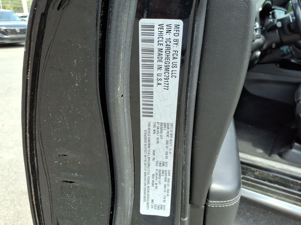 Anodized Platinum Appearance Package, Premium Entertainment Group (19 harman/kardon Amplified Speakers w/Subwoofer, 825 Watt Amplifier, Blu-Ray Compatible Dual Screen Video, and Rear-Seat Video System), Quick Order Package 2BP, 10.1 Touchscreen Display, 3.27 Rear Axle Ratio, 3rd row seats: split-bench, 4-Wheel Disc Brakes, 4G LTE Wi-Fi Hot Spot, 9 Speakers, ABS brakes, Air Conditioning, Alloy wheels, AM/FM radio: SiriusXM w/360L, Anti-whiplash front head restraints, Apple CarPlay, Apple CarPlay/Android Auto, Audio memory, Auto High-beam Headlights, Auto-dimming door mirrors, Auto-dimming Rear-View mirror, Auto-leveling suspension, Automatic temperature control, Brake assist, Bumpers: body-color, Compass, Connected Travel & Traffic Services, Delay-off headlights, Disassociated Touchscreen Display, Driver door bin, Driver vanity mirror, Dual front impact airbags, Dual front side impact airbags, Electronic Stability Control, Emergency communication system: SiriusXM Guardian, Four wheel independent suspension, Front anti-roll bar, Front Bucket Seats, Front Center Armrest w/Storage, Front dual zone A/C, Front fog lights, Front License Plate Bracket, Front reading lights, Fully automatic headlights, Garage door transmitter, Global Telematics Box Module (TBM), Google Android Auto, GPS Antenna Input, GPS Navigation, HD Radio, Heated door mirrors, Heated front seats, Heated rear seats, Heated steering wheel, Heavy-Duty Engine Cooling, Illuminated entry, Integrated Center Stack Radio, Integrated Voice Command w/Bluetooth®, Knee airbag, Leather steering wheel, Low tire pressure warning, Memory seat, Nappa/Axis II Seats w/Rhombi Logo, Navigation system: TomTom, Occupant sensing airbag, Outside temperature display, Overhead airbag, Overhead console, Panic alarm, ParkView Rear Back-Up Camera, Passenger door bin, Passenger vanity mirror, Power door mirrors, Power driver seat, Power Liftgate, Power moonroof, Power passenger seat, Power steering, Power windows, Radio data system, Radio: Uconnect 5 Nav w/10.1 Display, Rain sensing wipers, Rear air conditioning, Rear anti-roll bar, Rear reading lights, Rear seat center armrest, Rear window defroster, Rear window wiper, Remote keyless entry, Roof rack, Security system, SiriusXM Guardian - Included Trial (B), SiriusXM Satellite Radio, SiriusXM w/360L, Speed control, Speed-sensing steering, Speed-Sensitive Wipers, Split folding rear seat, Spoiler, Steering wheel mounted audio controls, Tachometer, Telescoping steering wheel, Tilt steering wheel, Traction control, Trip computer, Tungsten Interior Accent Stitch, Turn signal indicator mirrors, USB Host Flip, Variably intermittent wipers, Ventilated front seats, Voltmeter, and Wheels: 20 x 8.0 Satin Carbon Aluminum.