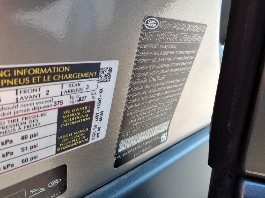 13 Speakers, 3.31 Axle Ratio, 4-Wheel Disc Brakes, ABS brakes, Adaptive suspension, Air Conditioning, Alloy wheels, AM/FM radio: SiriusXM, Android Auto, Apple CarPlay, Apple CarPlay & Android Auto, Auto tilt-away steering wheel, Auto-dimming door mirrors, Auto-dimming Rear-View mirror, Auto-leveling suspension, Automatic temperature control, Brake assist, Bumpers: body-color, Child-Seat-Sensing Airbag, Compass, Delay-off headlights, Driver door bin, Driver vanity mirror, Dual front impact airbags, Dual front side impact airbags, Electronic Stability Control, Emergency communication system: InControl Protect, Four wheel independent suspension, Front anti-roll bar, Front Bucket Seats, Front Center Armrest w/Storage, Front dual zone A/C, Front fog lights, Front reading lights, Fully automatic headlights, Garage door transmitter: HomeLink, Head restraints memory, Headlight cleaning, Heated door mirrors, Heated front seats, Illuminated entry, Leather Shift Knob, Low tire pressure warning, Memory seat, Navigation System, Occupant sensing airbag, Outside temperature display, Overhead airbag, Overhead console, Panic alarm, Passenger door bin, Passenger vanity mirror, Perforated Windsor Leather Seat Trim, Power adjustable front head restraints, Power door mirrors, Power driver seat, Power Liftgate, Power moonroof, Power passenger seat, Power steering, Power windows, Radio data system, Radio: Meridian Sound System (380W), Rain sensing wipers, Rear anti-roll bar, Rear fog lights, Rear reading lights, Rear seat center armrest, Rear window defroster, Rear window wiper, Remote keyless entry, Security system, Speed control, Speed-sensing steering, Speed-Sensitive Wipers, Split folding rear seat, Spoiler, Steering wheel memory, Steering wheel mounted audio controls, Tachometer, Telescoping steering wheel, Tilt steering wheel, Traction control, Trip computer, Turn signal indicator mirrors, Variably intermittent wipers, and Wheels: 21 5 Split-Spoke Silver 'Style 5085'